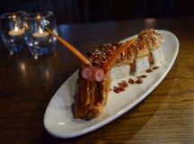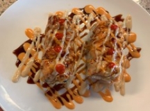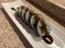 in - deep fried white fish, avocado, krabmeat, spicy tuna, cucumber